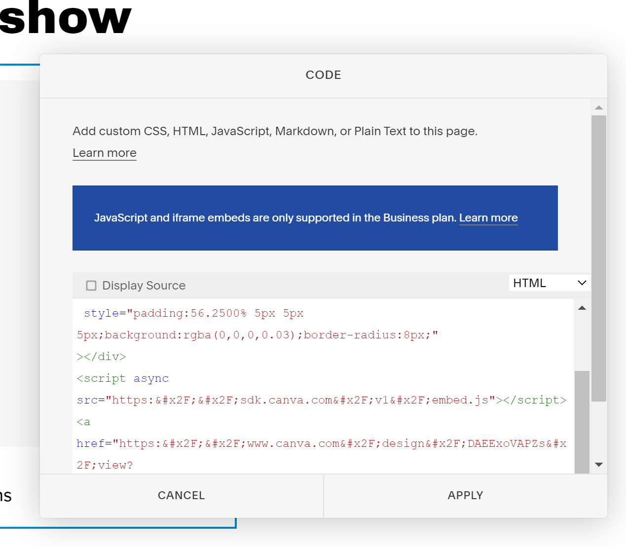 Now that we have the code. I am going to head over to the website I want to embed the design in. I am using Squarespace for this examples. Select the code block.
