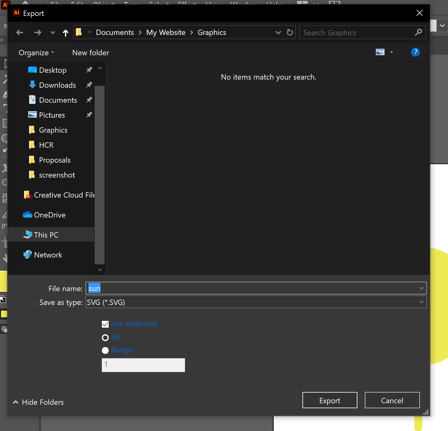 Name the file, save as type as svg and check the “use the artboards”. Click export.
